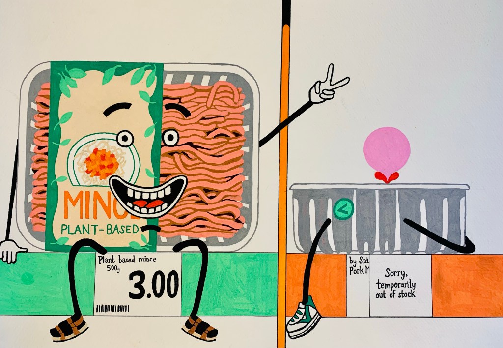 This drawing is based on my experience of going food shopping in the first lockdown, spring 2020, and finding that the supermarket’s meat isle was completely empty apart from the shelf of plant-based mince.